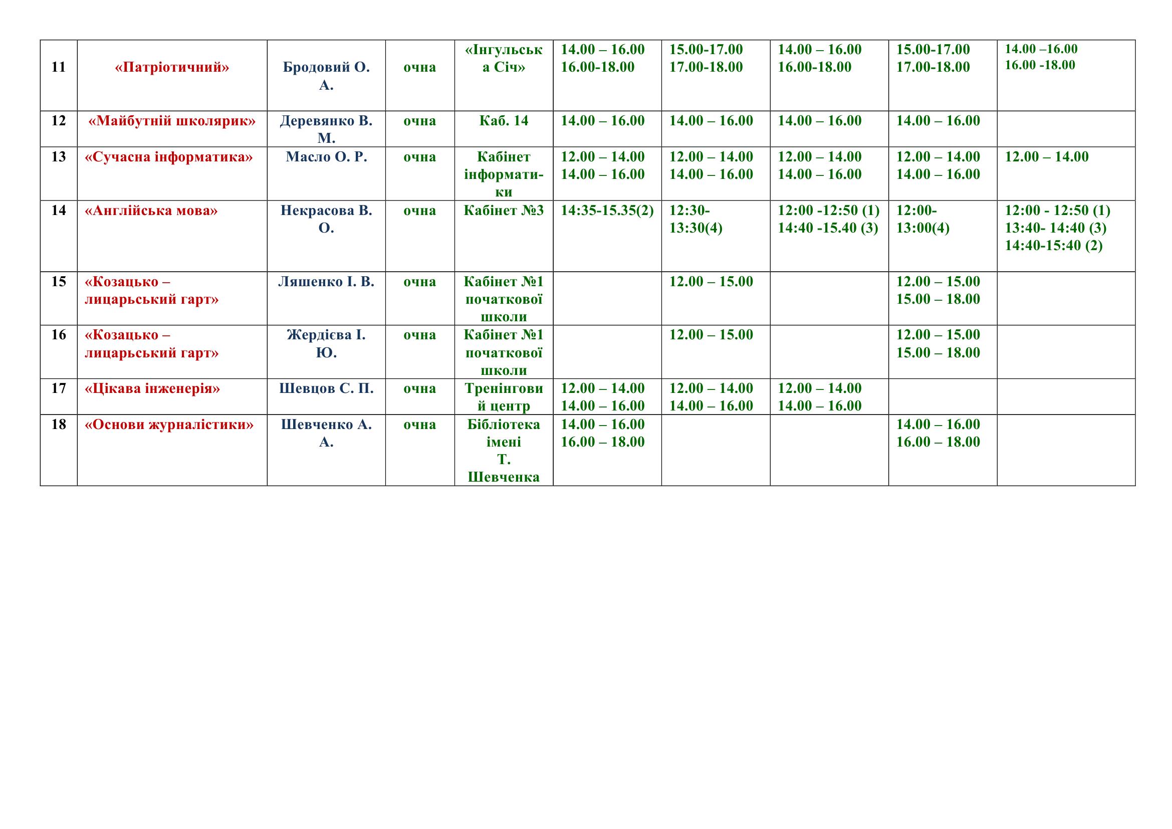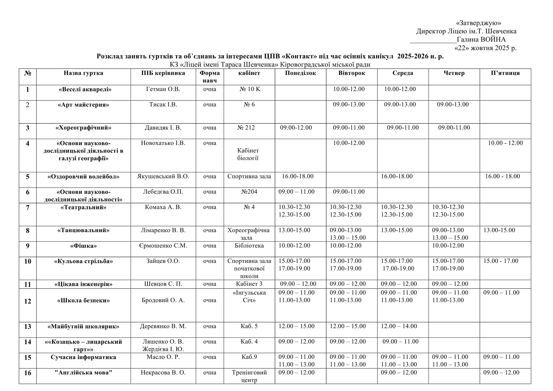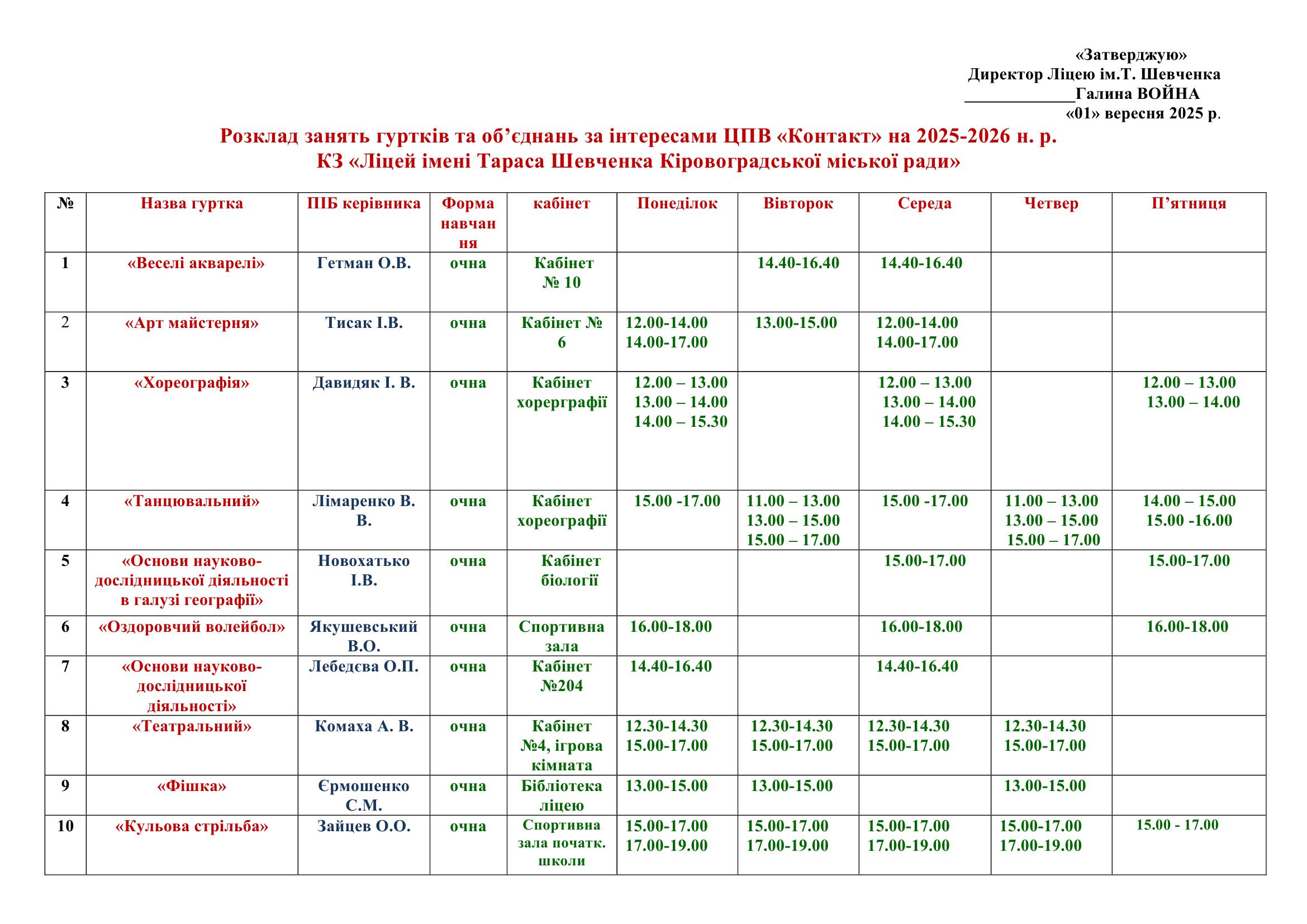 Розклад занять гуртків та об'єднань за інтересами ЦПВ «Контакт»