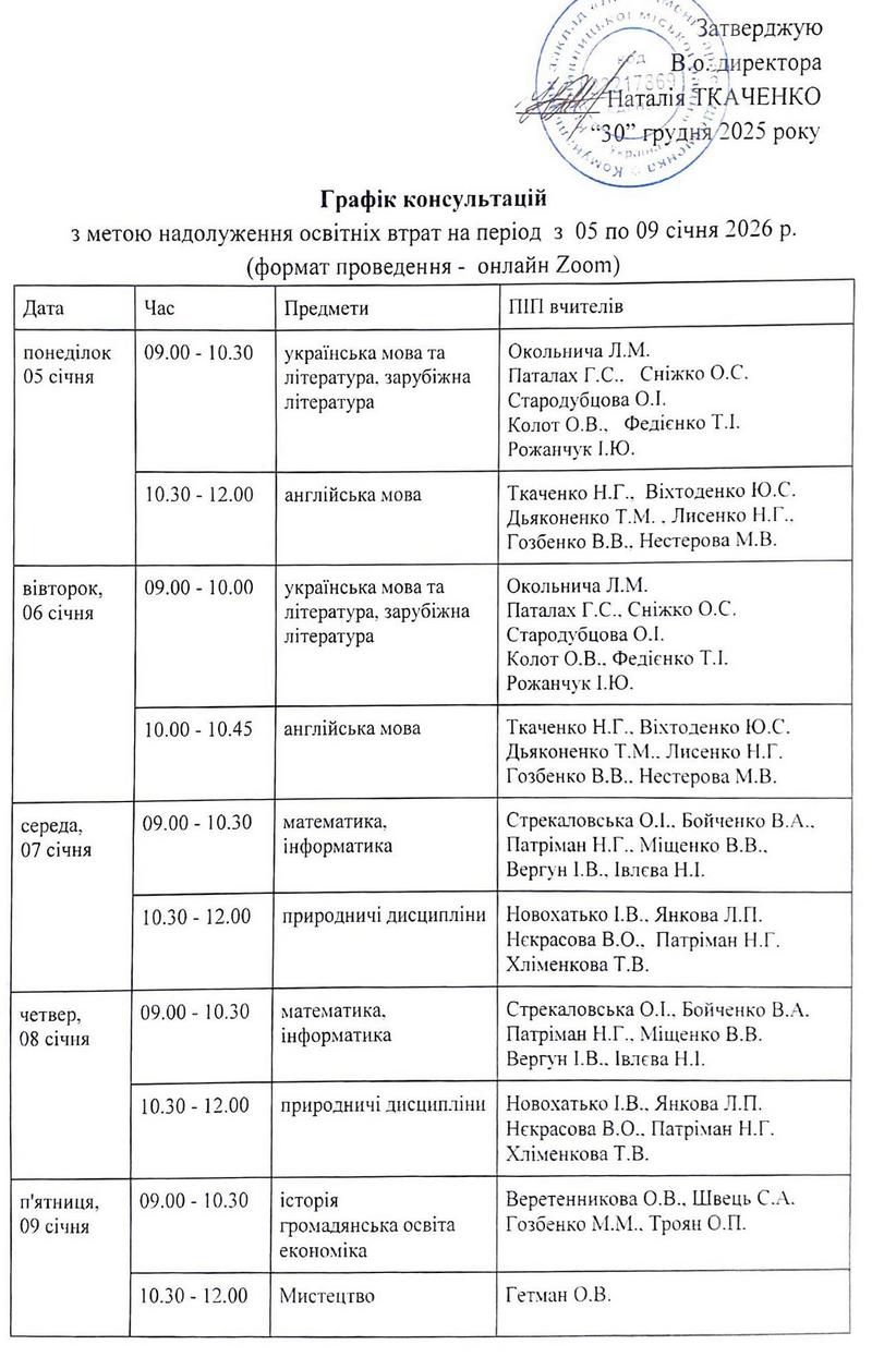 Графік консультацій для учнів 5-11 класів