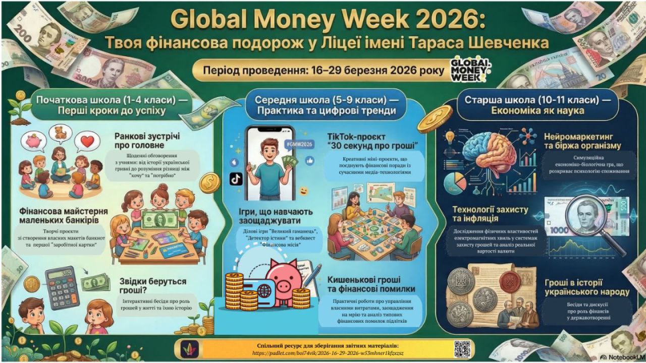 З 16 по 29 березня 2026 року наш ліцей приєднується до всесвітньої ініціативи Global Money Week! Ми підготували неймовірний марафон заходів, де кожен — від першачка до випускника — знайде щось цікаве для себе.